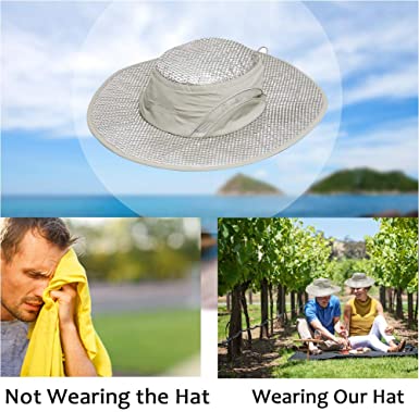 【Dry& Wet Use】Built-in evaporative cooling lining and adopting evaporative cooling technology. Fluid vaporization takes heat from the subtropical zone, quickly transfers moisture from the skin into the hats where it spreads across the surface evaporates rapidly and keeps cool. Just wet with water, you will get cooler 20° F than outside temperature. If you prefer do not wear a wet hat on you head, it will be best choice for sunscreen hats to protect UV and heat when you wear it on dry condition .